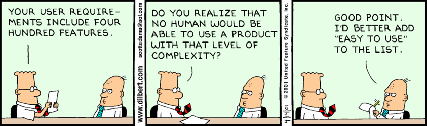 Hay una gran metáfora en el idioma alemán, que es "Eierlegende Wollmilchsau" o "Egg-laying-wool-milk-pig". Significa una cosa que trata de ser todo. Y en última instancia la complejidad sin fin provoca que falle
